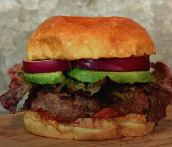 Mix the patty ingredients, and then gingerly and briefly form 4 patties of similar size, each about an inch thick. With the back of a spoon, make a shallow indentation in the center of each patty to prevent them from forming a dome as they cook. Refrigerate the patties until you are ready to grill. Ready the grill for direct cooking over medium (350° to 450°F). Grill the patties over medium heat, with the lid closed, until cooked to 160°F, 8 to 10 minutes for medium, turning once or twice. During the last minute of grilling, toast the rolls, cut side down, over direct heat. Serve the patties on the toasted rolls with the jam, lettuce, red onion, and avocado.