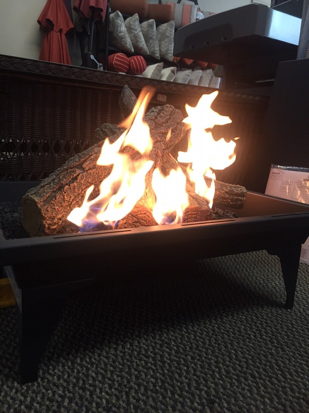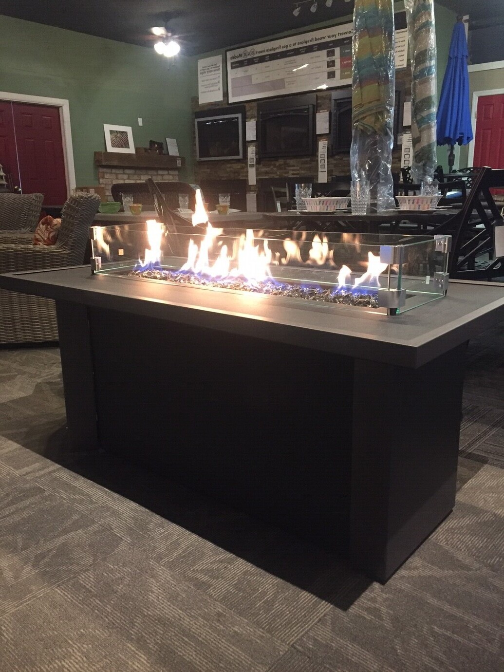 Some possibilities towards enhancing your outdoor space include our Barbara Jean 27×20 rectangular fire pit. This fire pit comes with lava rock, a 5ft hose and an LP regulator. You can also purchase a 4 piece cast Oak log set that adds to the realism of any fire in the pit. What better way to offer to offer guests a warm welcome to your patio or outdoor space than this fire pit which offers the view of a traditional campfire?